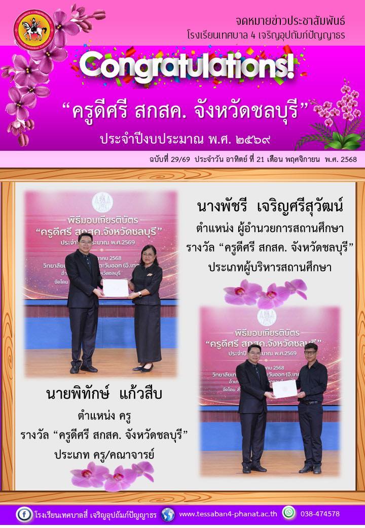 ขอแสดงความยินดีกับนางพัชรี เจริญศรีสุวัฒน์ ผู้อำนวยการสถานศึกษา เนื่องในโอกาสได้รับรางวัล "ครูดีศรี สกสค. จังหวัดชลบุรี" ประเภทผู้บริหารสถานศึกษา และนายพิทักษ์ แก้วสืบ ครู วิทยฐานะครูชำนาญการพิเศษ ได้รับรางวัล "ครูดีศรี สกสค. จังหวัดชลบุรี" ประเภท ครู/คณาจารย์ ประจำปีงบประมาณ 2569